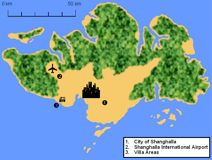Shanghalla Island is primarily wilderness, the majority of the land impenetrable jungle. As a result the bulk of the economy is driven by trade, legal and illegal. The jungle is dotted with scattered villages and reclusive estates, linked by ill-maintained roads. The one road that is in excellent condition is the one connecting the main airport with the city of Shanghalla. The city sits on the coast around a natural harbor that is home to vessels of all shape, size, and legality. The lower town portion of the city sits in the coastal area and is made of slums, warehouses, and the seedier side of the city's entertainment. Upper town is a modern city of glittering skyscrapers, shining hotels, and high-end casinos and clubs.