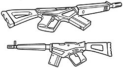 The M-25 "Wolverine" has become the REF's main assault weapon. It can be set for single shot, semiautomatic, or full automatic, and fires 4.45mm caseless rounds. The auto-firing grenade launcher can fire four 25mm high explosive grenades before needing reloading. The M-35 comes equipped with a bipod and infrared telescopic sight.