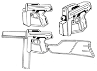 This simple laser pistol functions much like a semiautomatic pistol. The person can squeeze off shots as quickly as he can move his trigger finger, unlike an automatic weapon that will continue to fire as long as the trigger is depressed.