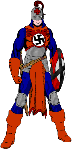 The Swastika is in peak physical condition and is a master of modern weaponry. He probably one of the most skilled soldiers in the world, a master tactician trained in the use of all forms of armed and unarmed combat. The Swastika has acquired a new suit of armor and sword, with a stylized Teutonic appearance but made from the most advanced materials available.