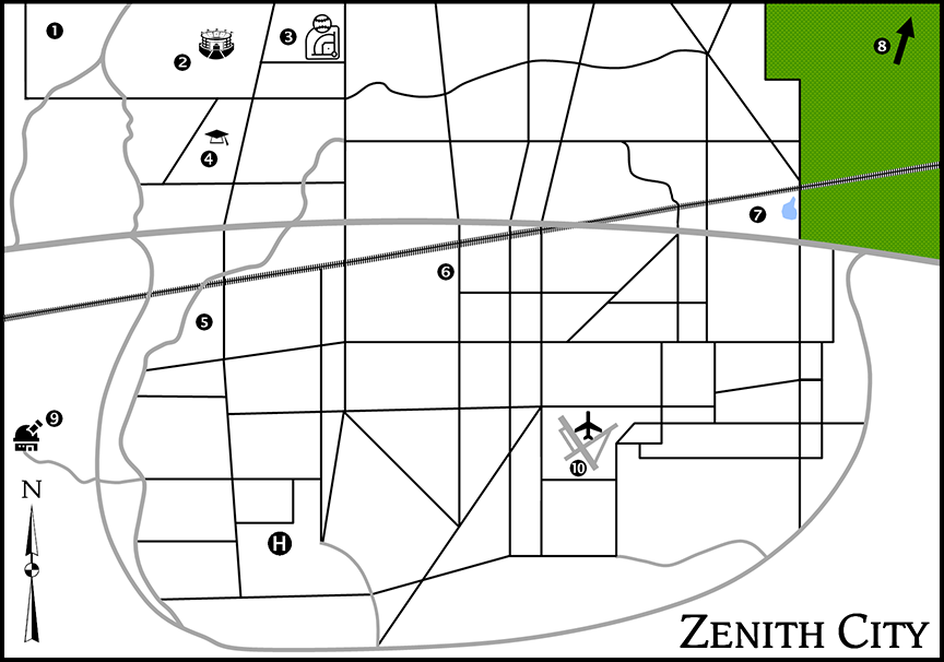 The modern Zenith City is built up around the cross-country rail line and interstate highway that pass through it. The city sits in a valley at an average elevation of around 5.000 feet, with mountains on three sides providing stellar views to inhabitants and visitors alike.