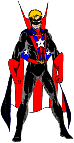 Seeing crime activities increasing in SF, Keith thought it would be a kick to go out and bust some goons. He chose an American motif as a costume because he saw it as THE symbol for capitalism. He wouldn't wear anything prissy like Captain America's uniform so he created a black costume that would allow him the stealth he needed at night. He would be the everyman people could look to, not some has-been 1940 soldier. He would be THE American. Already the serum was poisoning his mind.