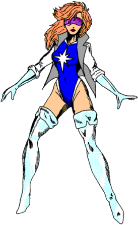 History: Julie Madison was born in San Diego, the only child of a wealthy family. Her father Jason is the head of Madison Industries, a respected research and development facility. While Julie was in university, Madison Industries began working on alternative energy sources. Project: Starlight was in its final stages and was very top secret. Using their private satellite, M.I. scientists had discovered an energy signature unique to Earth's solar system. They built special equipment to tap into that energy, and beam it from space. Once harnessed, they believed it could run the most powerful generators indefinitely, and with no harmful waste products. Julie's dad invited her to the test run. She watched as a blue-white light – which the scientists had dubbed quantum energy – filled the test chamber. The gigantic generator powered up immediately and ran at peak efficiency – for about ten seconds. The equipment overloaded and threatened to explode. Flares of energy shot all over the room. The technicians hit the controls to reverse the energy flow, sending it back into space. The energy dissipated, and the project was shut down. Shortly thereafter, Julie began demonstrating unusual new talents – such as flying, and manifesting solid light constructs in whatever form she imagined. She and her father figured out that the quantum energy had infused itself in her, instead of beaming back into space. At first, she used her new powers discreetly, but was soon contacted by Midnight Express, and co-founded the Cavaliers as Flare.