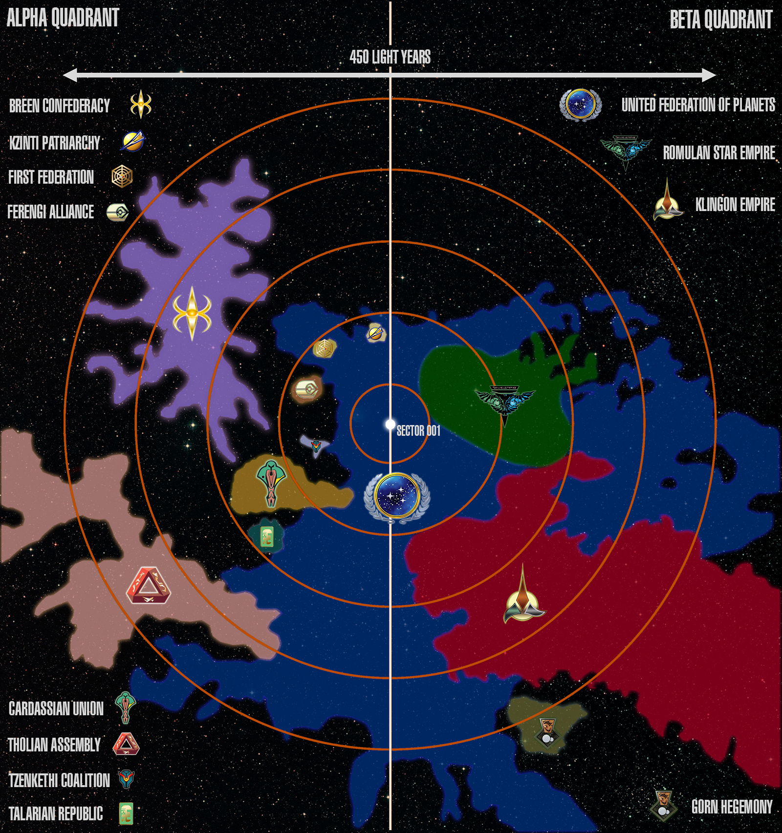 Not all political entities in the region are represented on this map. Those selected represent the major powers bordering the United Federation of Planets as well as those smaller powers that still contain multiple star systems and have regular interaction with the Federation. Details on these political entities can be found in the Alpha Quadrant and Beta Quadrant sections.